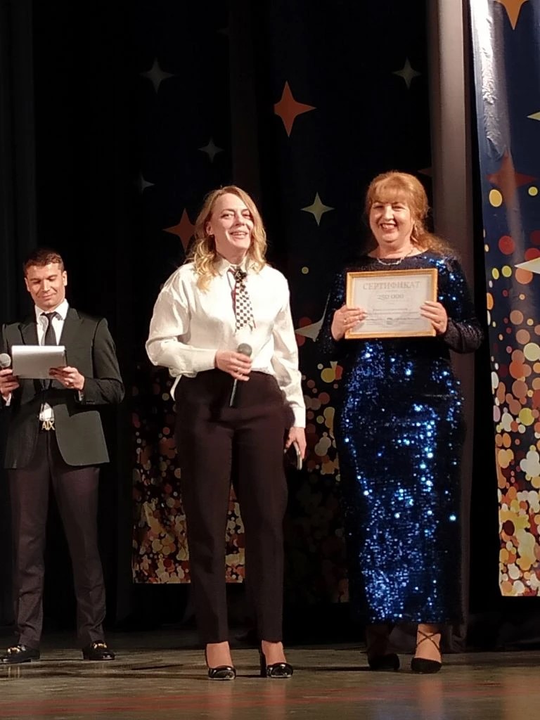 Помощник депутата Совета депутатов города Новосибирска, Прохорова Евгения Николаевича, поздравила гостей зала с 60-летним Юбилеем ЦВР «Галактика» и передала Надежде Петровне Агаповой Сертификат на развитие центра.