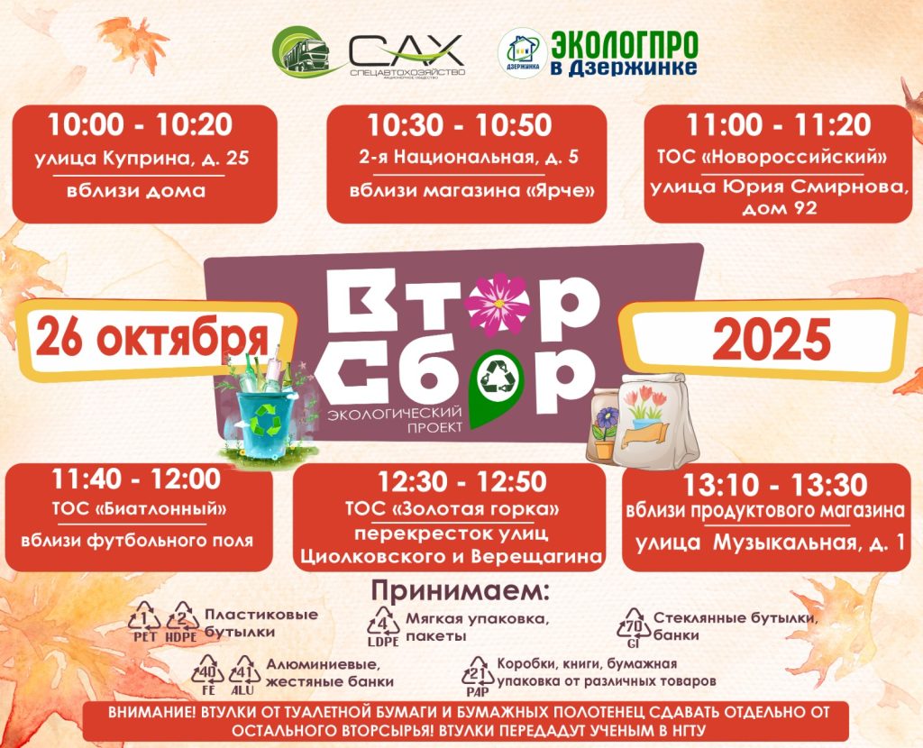 Экомобиль АО «САХ» и экоактивистка Анастасия Жаркова будут принимать вторсырьё в частном секторе Дзержинского района. 10.00-10.20 – вблизи дома № 25 на ул. Куприна; 10.30-10.50 – вблизи магазина «Ярче» на ул. 2-й Национальной; 11.00-11.20 – у дома № 92 на ул. Юрия Смирнова; 11.40-12.00 – вблизи футбольного поля в ТОС «Биатлонный»; 12.30-12.50 – на перекрёстке ул. Циолковского и ул. Верещагина; 13.10-13.30 – вблизи продуктового магазина на ул. Музыкальной. В экомобиле можно будет обменять пластиковые бутылки, алюминиевые и жестяные банки, мягкую упаковку и пакеты, коробки и старые книги на семена цветов. Также примут втулки от туалетной бумаги и полотенец. Собранное вторсырьё отправится на переработку.