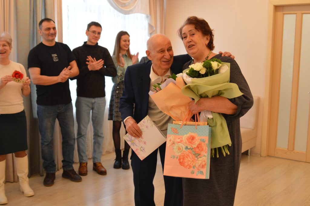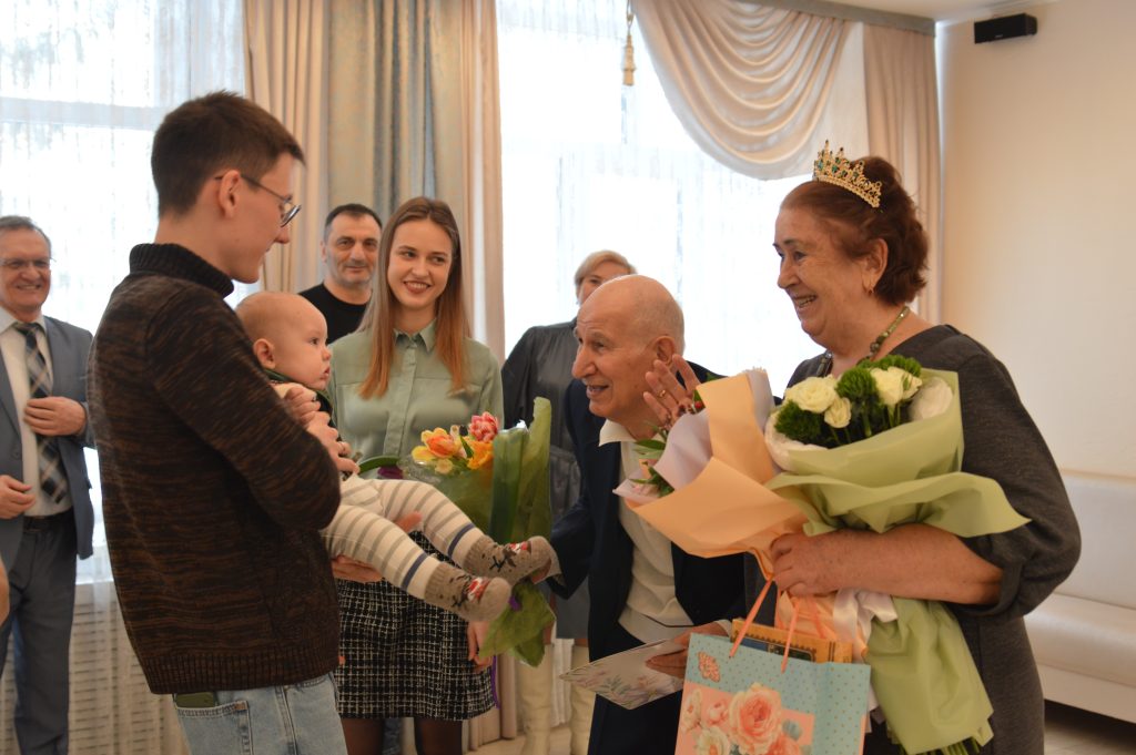 История этой семьи началась в далеком 1970 году. Судьбоносная встреча произошла в поезде, и эта случайная дорожная беседа переросла в глубокое чувство, которое пара бережно хранит уже 55 лет. Главным достижением и счастьем юбиляров стало их продолжение — в любви они воспитали двоих детей, а сегодня радуются успехам пятерых внуков.