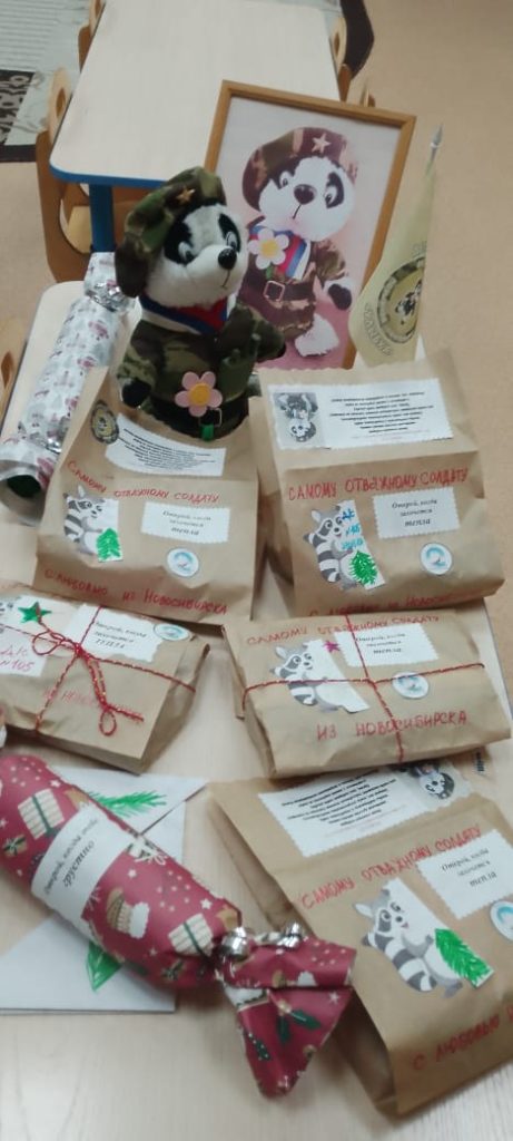 Все подарочки дети делали вместе с нашим главным воспитанником – енотом Цветочком, которого воспитанники очень любят. Но если самые маленькие с ним просто играют: кормят, катают на машинке, укладывают спать, то старшие дети относятся к нему очень трепетно, всерьез считая, что именно он помогает нашим солдатам на войне, недаром и позывной ему придумали: «Почтальон».