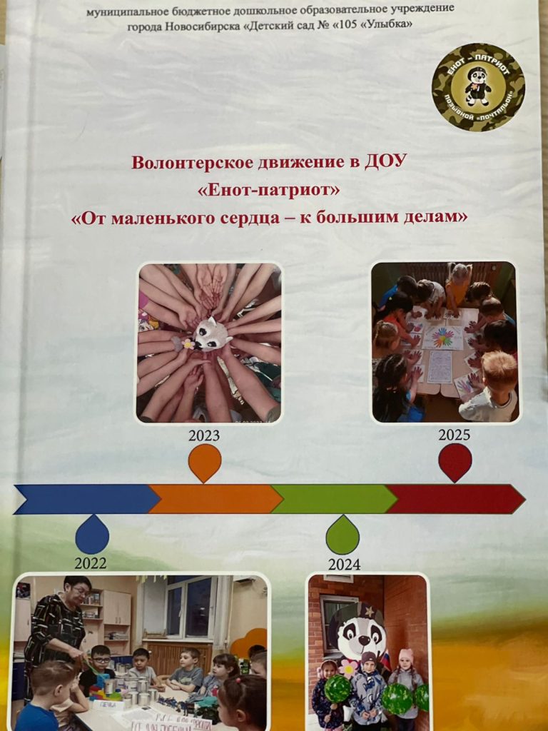 Очень интересен опыт работы по организации патриотического воспитания детей в МБДОУ «Детский сад № 105 «Улыбка» Дзержинского района. Педагогический коллектив детского сада и родители воспитанников приняли решение об оказании гуманитарной помощи бойцам специальной военной операции (далее СВО). Собирая первый гуманитарный груз в зону СВО решили отправить почтальоном любимую игрушку детей пушистого Енота по имени «Цветочек» (в саду создан мини-музей «В гостях у Енота», в котором находятся около 80 игрушечных енотов). Каждый раз сопровождала гуманитарный груз детского сада руководитель волонтерской группы «Поможем нашим. Регион 54» Юлия Васильева (в настоящее время оформлен контракт). Помимо медикаментов, термобелья, балаклав и многого другого, что необходимо в условиях СВО Енот «Цветочек» передавал бойцам письма, детские рисунки, стихи и маленьких енотиков – талисманчиков.