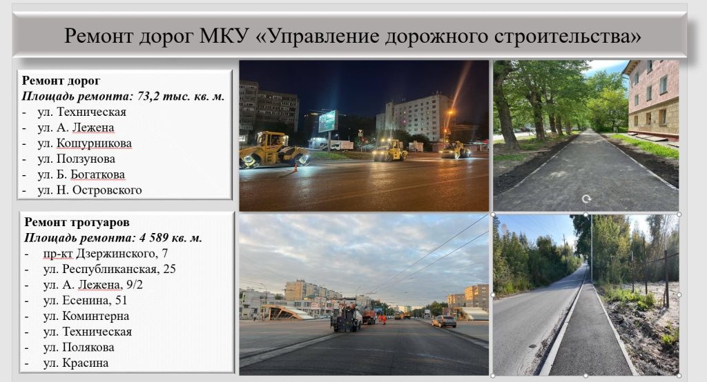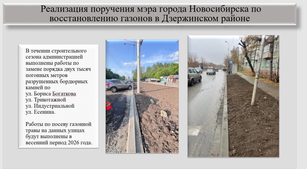 В течении строительного сезона выполнены работы по замене двух тысяч метров разрушенных бордюрных камней по ул. Бориса Богаткова, Трикотажной, Индустриальной. Начаты работы по ул. Есенина. Работы по посеву газонной травы на данных улицах будут выполнены в весеной. Летом текущего года выполнены работы по посеву травы на проспекте Дзержинского.