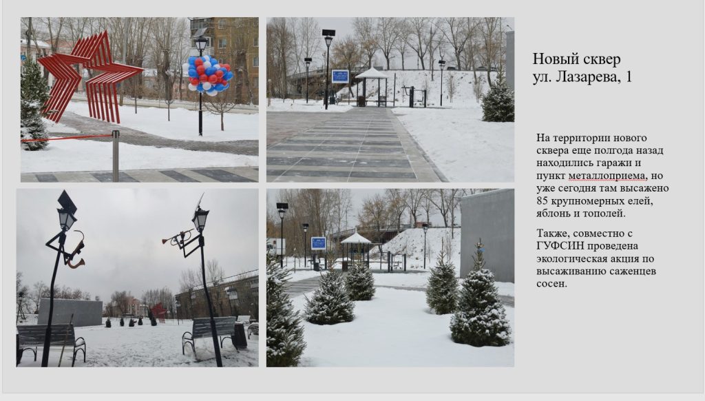 Новый сквер: Новый сквер, построенный по адресу ул. Лазарева, 1. Работы выполнены администрацией района и приурочены к 80-й годовщине Победы в Великой Отечественной войне.
