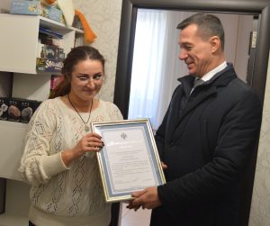 Сегодня глава администрации Дзержинского района Константин Соболев передал лично Благодарственное письмо Губернатора Новосибирской области А. В. Травникова, Екатерине Вячеславовне — жене военнослужащего разведывательно-штурмовой бригады (казачьей)