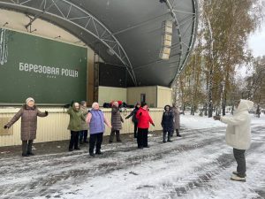 Сегодня в Берёзовой роще, несмотря на снег, в рамках Декады пожилого человека прошла лечебно-оздоровительная гимнастика для гостей элегантного возраста. Заряд бодрости, движение и хорошее настроение