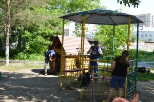Детскую площадку обновили во дворе дома на Учительской, 2. Представители управляющей компании и жители взяли в руки кисти и покрасили качели, скамейки, бордюры и другие элементы. «Все жители очень активные. Есть